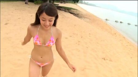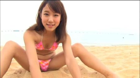 砂浜をスキップしながら、ピンクのビキニで登場
