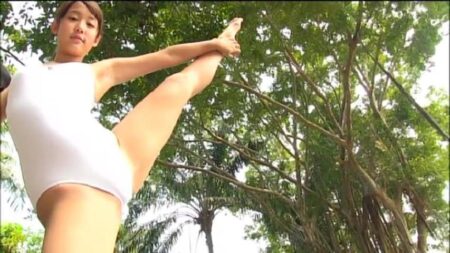白レオタードで登場、前屈で胸チラ