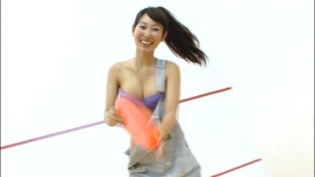 サロペット姿で登場、肩ひも外してバトミントン、この格好いい!(BGM小で生音)