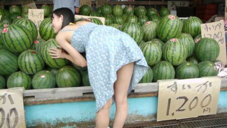 すいか撮影でも太ももチラ