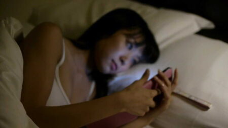 ベッドに入ってスマホ中、胸チラ