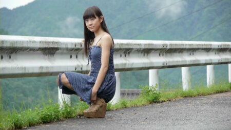 オレンジシャツとミニスカートで写真撮影
