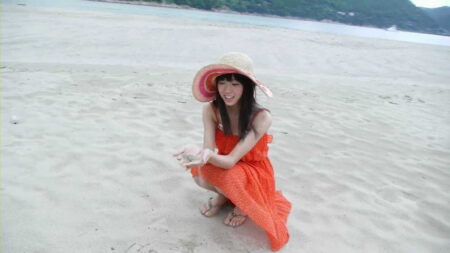 オレンジワンピで登場、白浜でしゃがむ