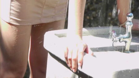 Tシャツにショートパンツで水遊び