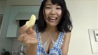 下着にエプロンで登場 果物見ながら「どれにしようかな?」 「むけた~」リンゴを持って「食べる?」「あ~ん」