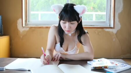 ねこコスプレでお勉強、ちょっとシュールな映像