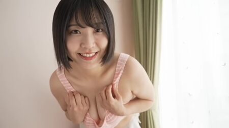 仰向けで手ブラ、恥ずかしいからか笑顔が消えて真顔なのも良い感じ