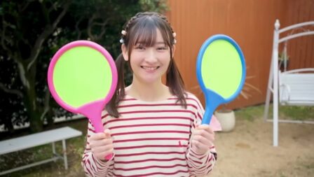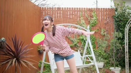 バドミントンみたなのをする、かなり下手だけどかわいいのでOK、自分でも「下手やなぁ~」って関西弁もかわいい、ミニスカかと思ったら下にショートパンツ履いてて残念
