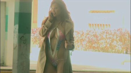 コートの下にV字水着を着て登場「もしもし着きました 人が来たらどうするんですか?恥ずかしいです」