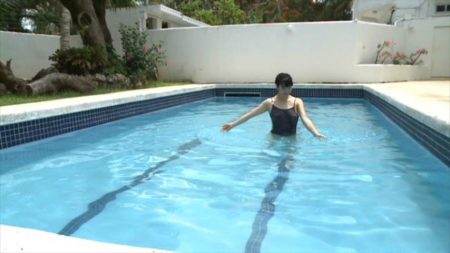 プールに黒水着で登場「ねえ 一緒に泳がない」